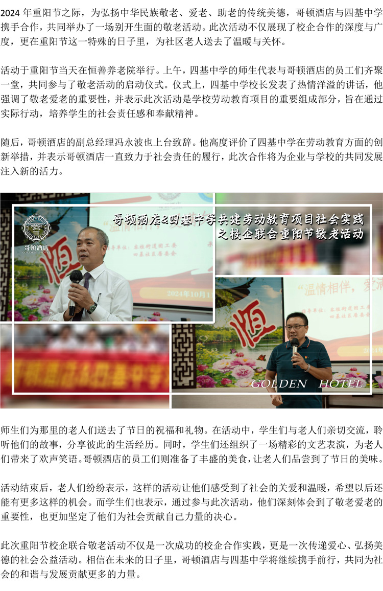 哥頓酒店&四基中學(xué)勞動(dòng)教育項(xiàng)目——重陽(yáng)節(jié)校企聯(lián)合敬老活動(dòng)圓滿成功
