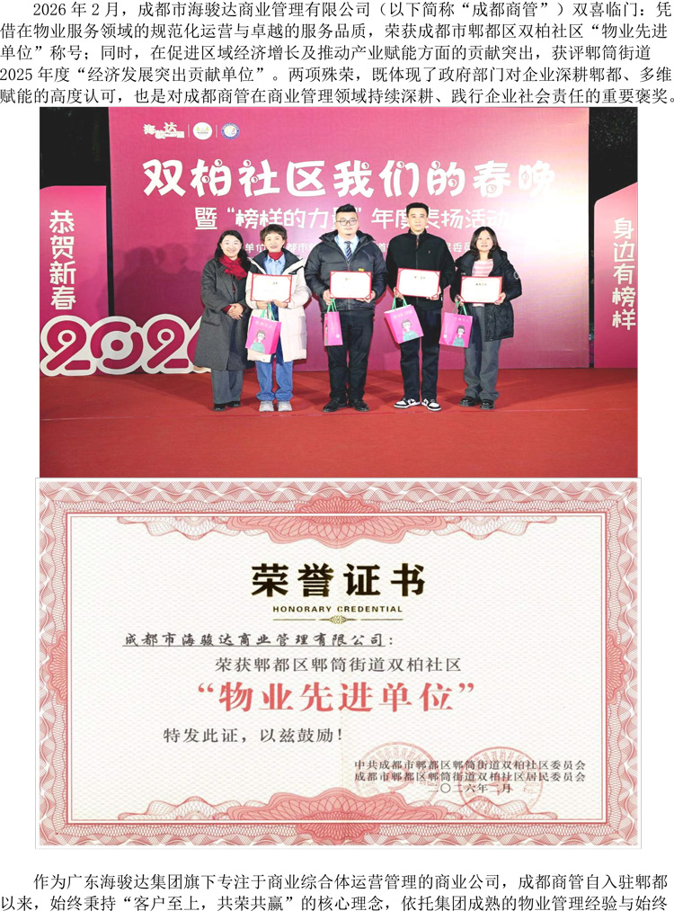 成都海駿達商業管理榮膺郫都區物業服務標桿與經濟發展貢獻兩大獎項